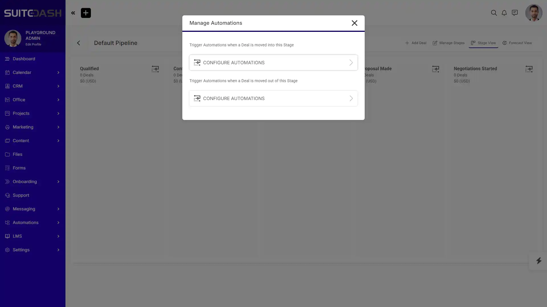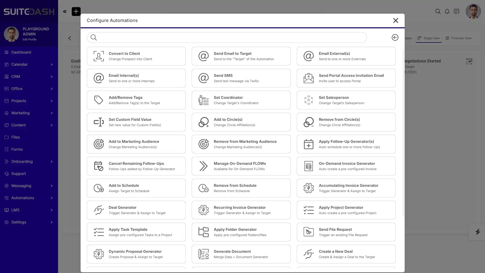 Manual nudges are productivity killers. SuiteDash lets you trigger emails, tasks, and even proposals when a deal hits a new stage.
